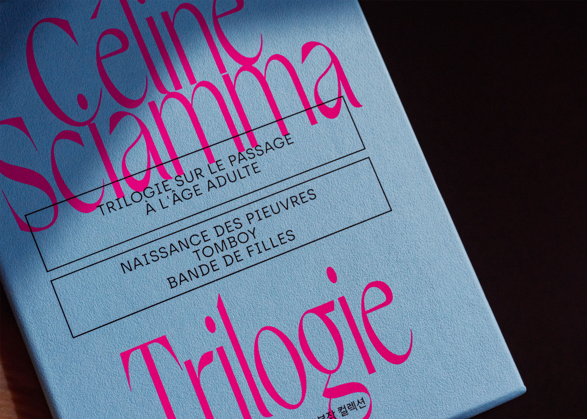 The Céline Sciamma Coming-Of-Age Trilogy Blu-ray Box Set is a Blu-ray collection of three coming-of-age films by filmmaker Céline Sciamma. It was officially released in South Korea for the first time in the world. Naissance des pieuvres(Water Lilies) (2007), Tomboy (2011), and Bande de filles (Girlhood) (2014). The protagonists of each movie go on a journey near and far to find their true 'self'. Inwardly, they feel a range of emotions and search for their true identity, and outwardly, they express the bonds, jealousies, and desires that arise from their relationships with the people around them. We wanted to create a mood of these unsettling, exciting, and beautiful times. Grand slang is a very beautiful typeface that we used for this task. We wanted to express imperfection by giving this perfect typeface a purposeful twist, so we transformed Grand slang into long, shadowy, tense typography to represent the complexities of growing up that we all experienced.
